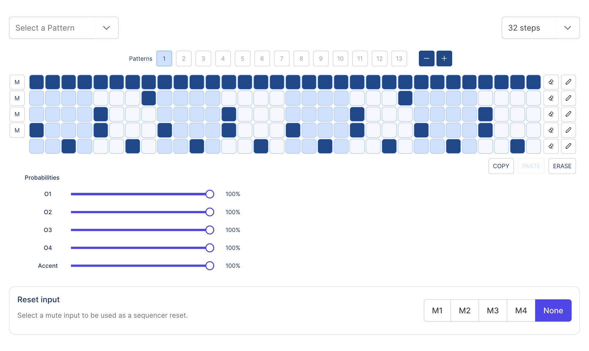 Explore 32-step patterns, probability-based sequencing, and CV-controlled pattern selection.